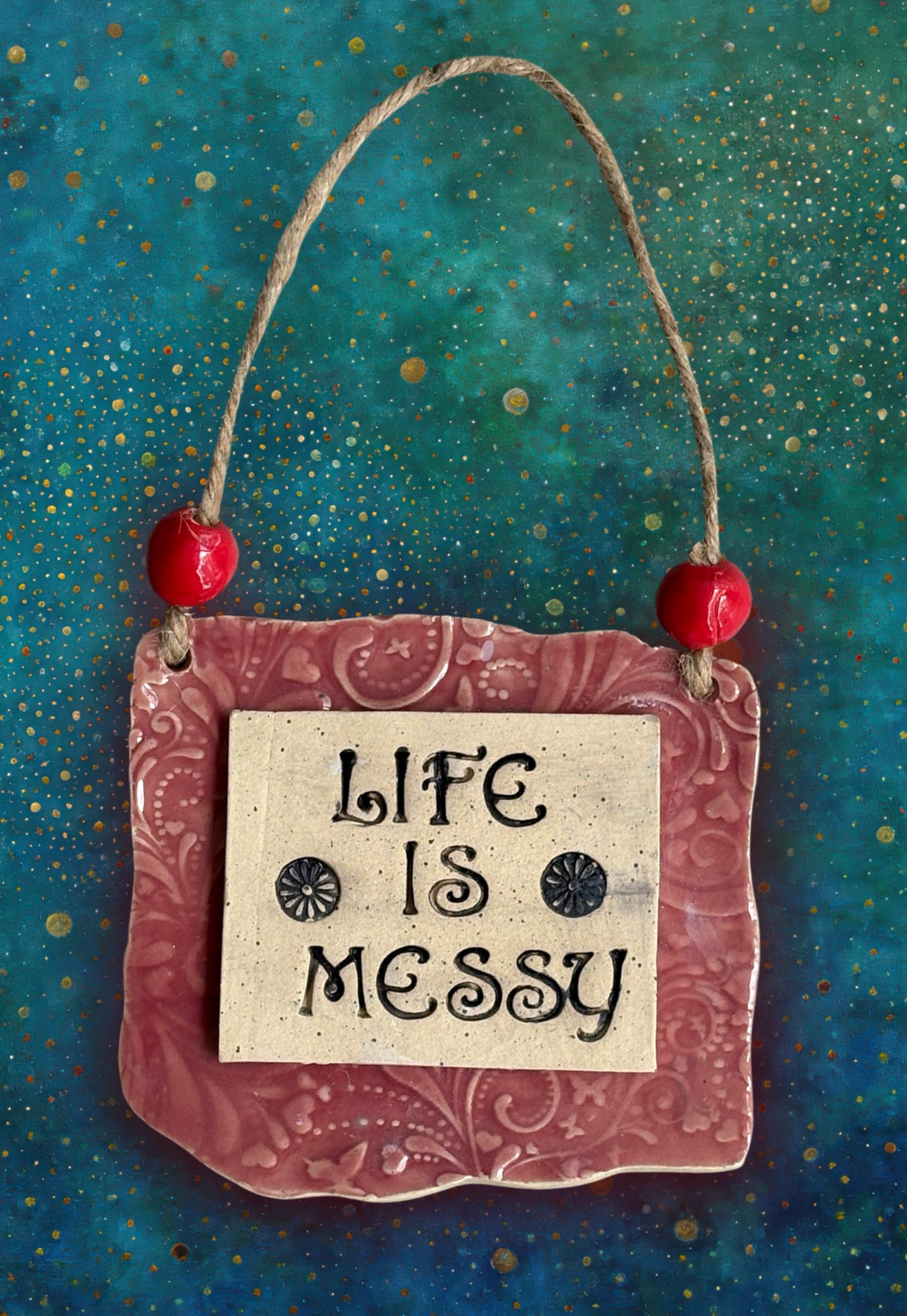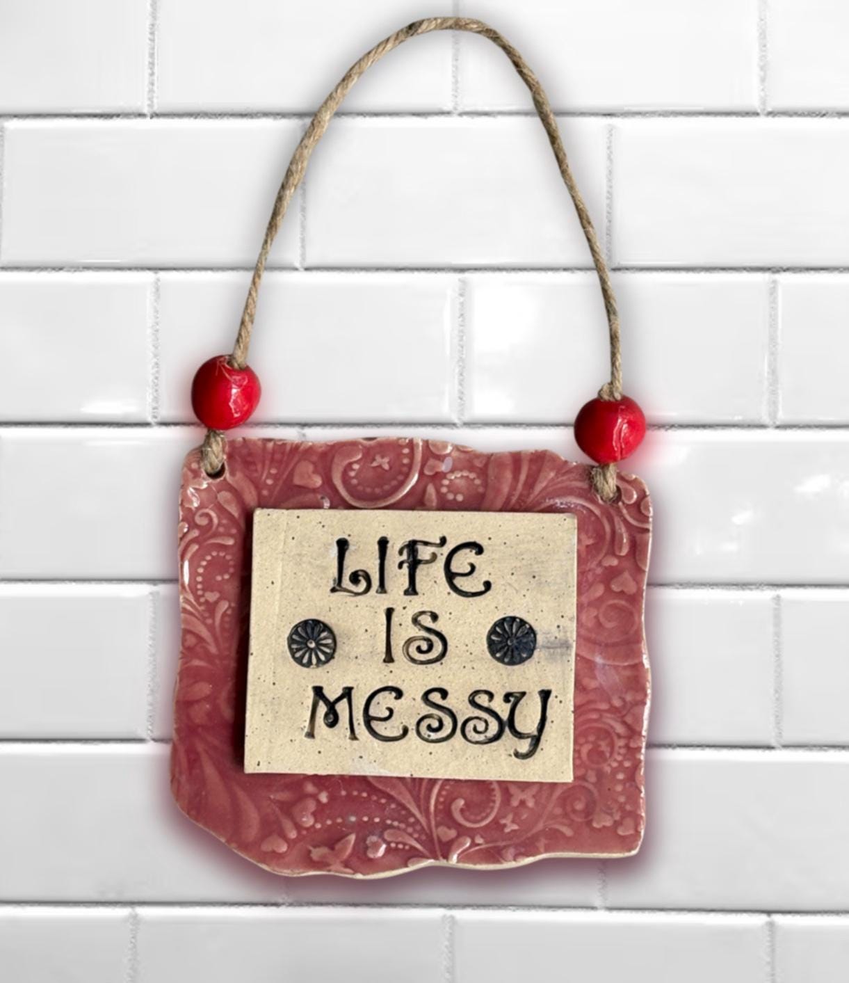 Add a touch of charm and humor to your home with this handmade ceramic wall hanger. The piece features a rustic cream-colored tile with the words “Life is Messy” stamped in bold black lettering, accented by two floral medallions. It is framed with a textured pink clay border pressed with a delicate floral and swirl pattern, giving it a whimsical boho feel.