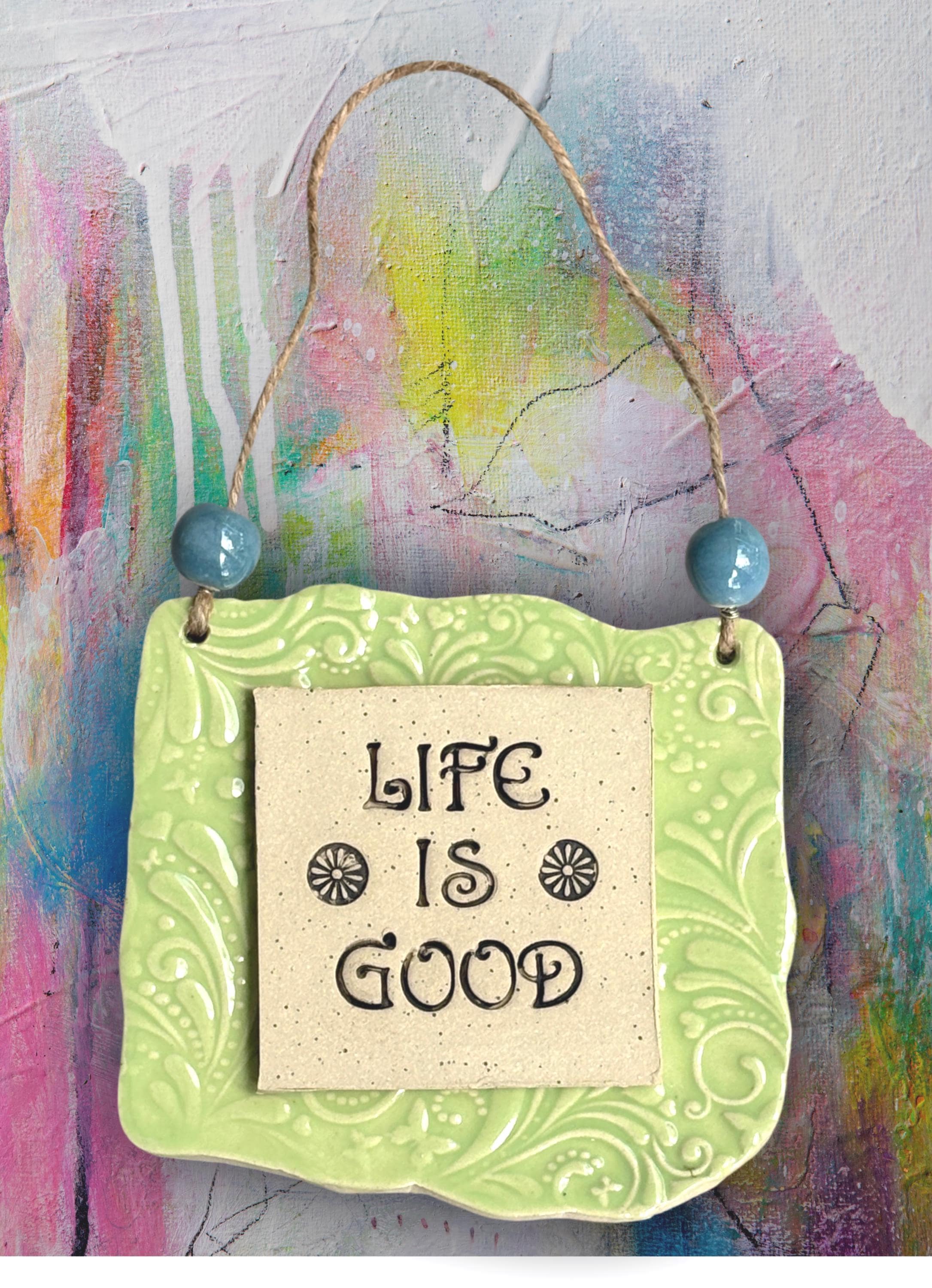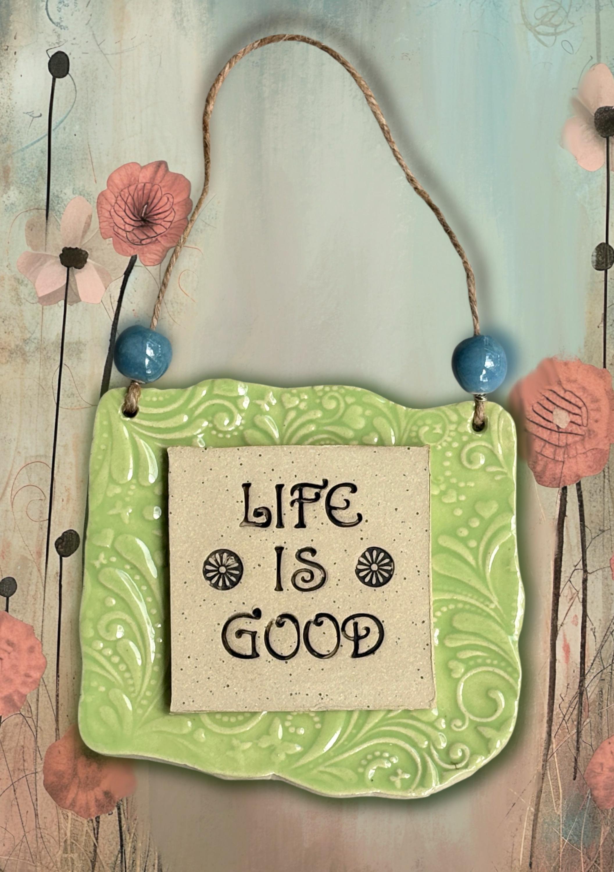 Add a touch of charm and encouragement to your home with this handmade ceramic wall hanging featuring the uplifting message: “Life is Good.” This one-of-a-kind piece is crafted from clay with a speckled stoneware center, delicately stamped with black lettering and floral accents. The plaque is framed with a soft green, embossed floral border that adds a whimsical, earthy feel. It hangs from a natural jute cord adorned with two glossy red ceramic beads, giving it a pop of color and a rustic-boho flair.