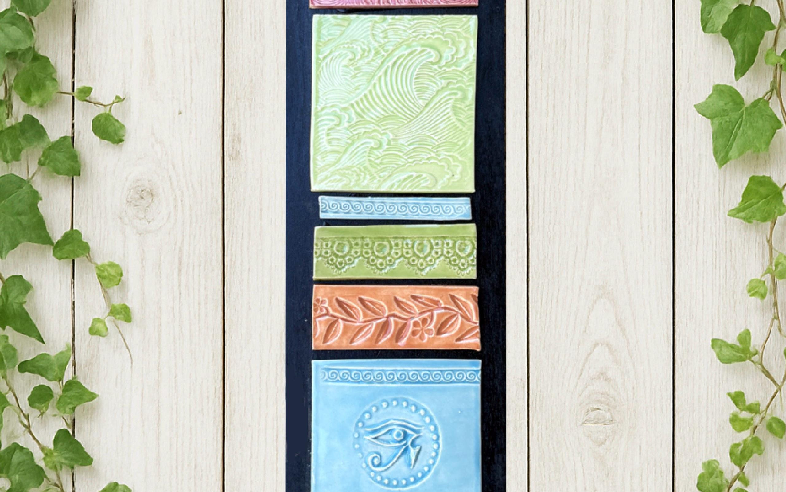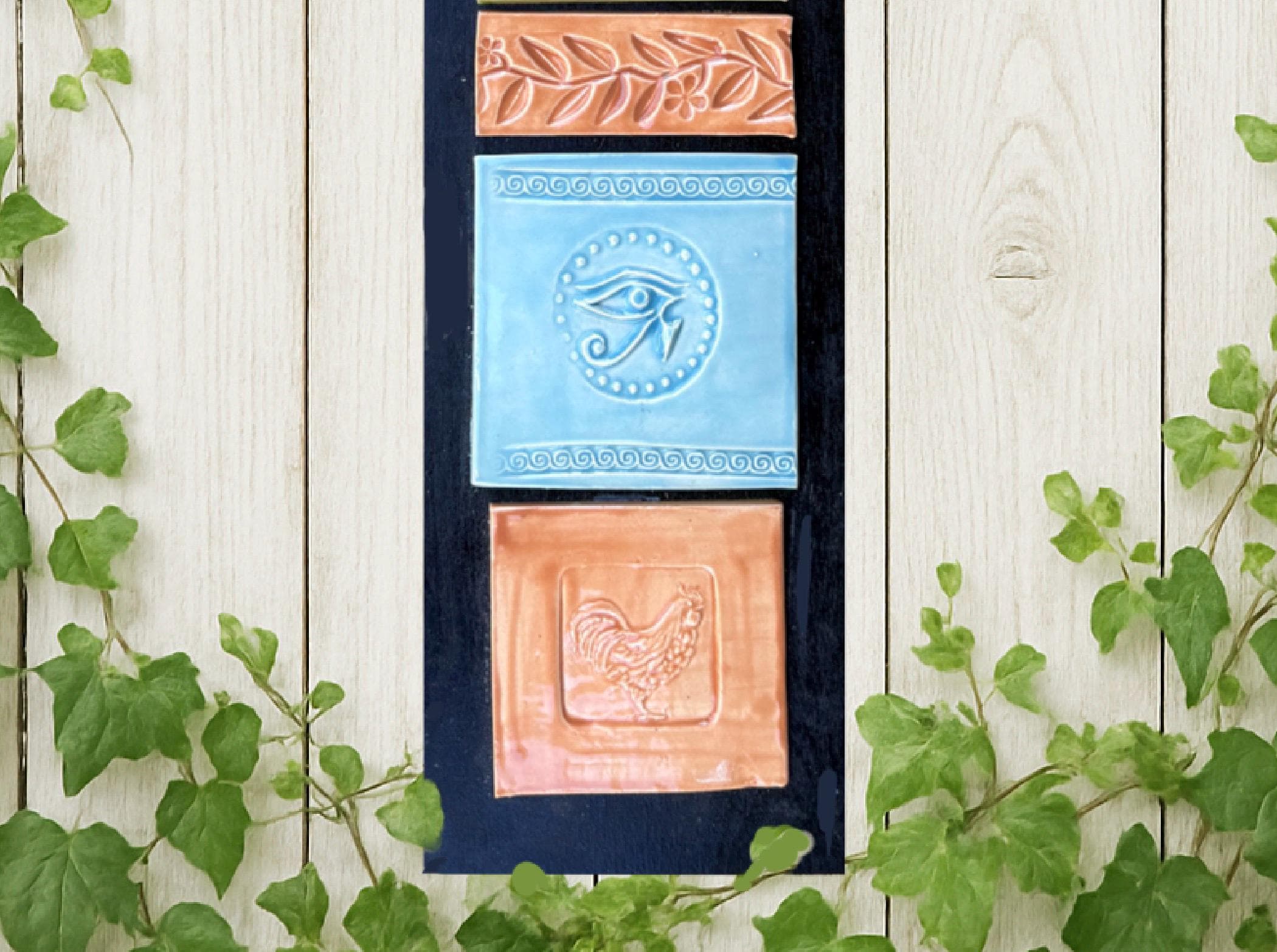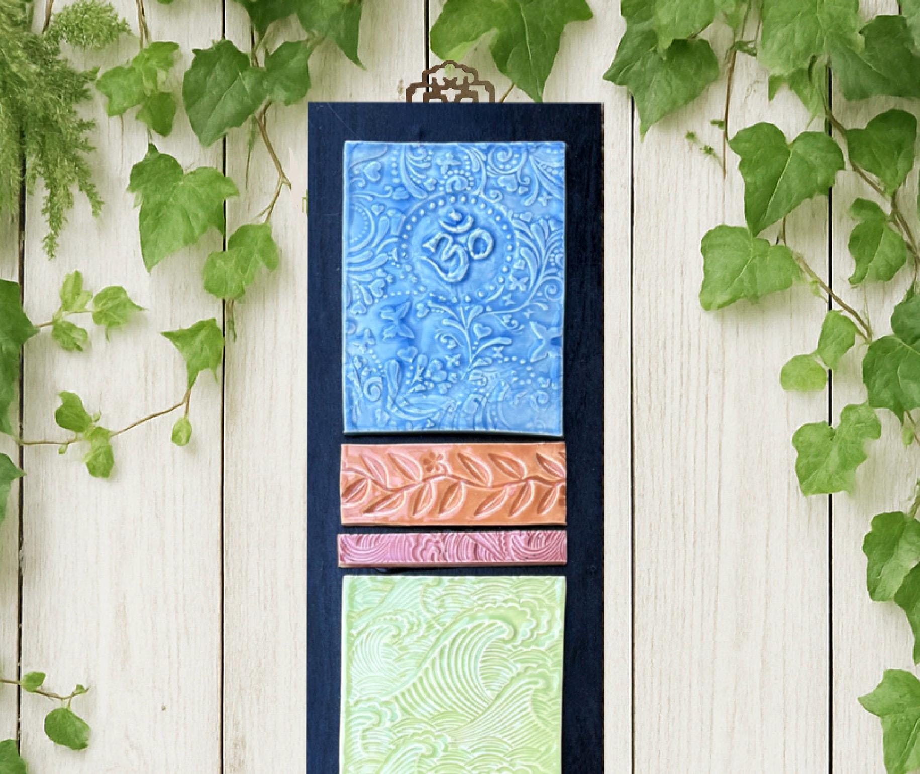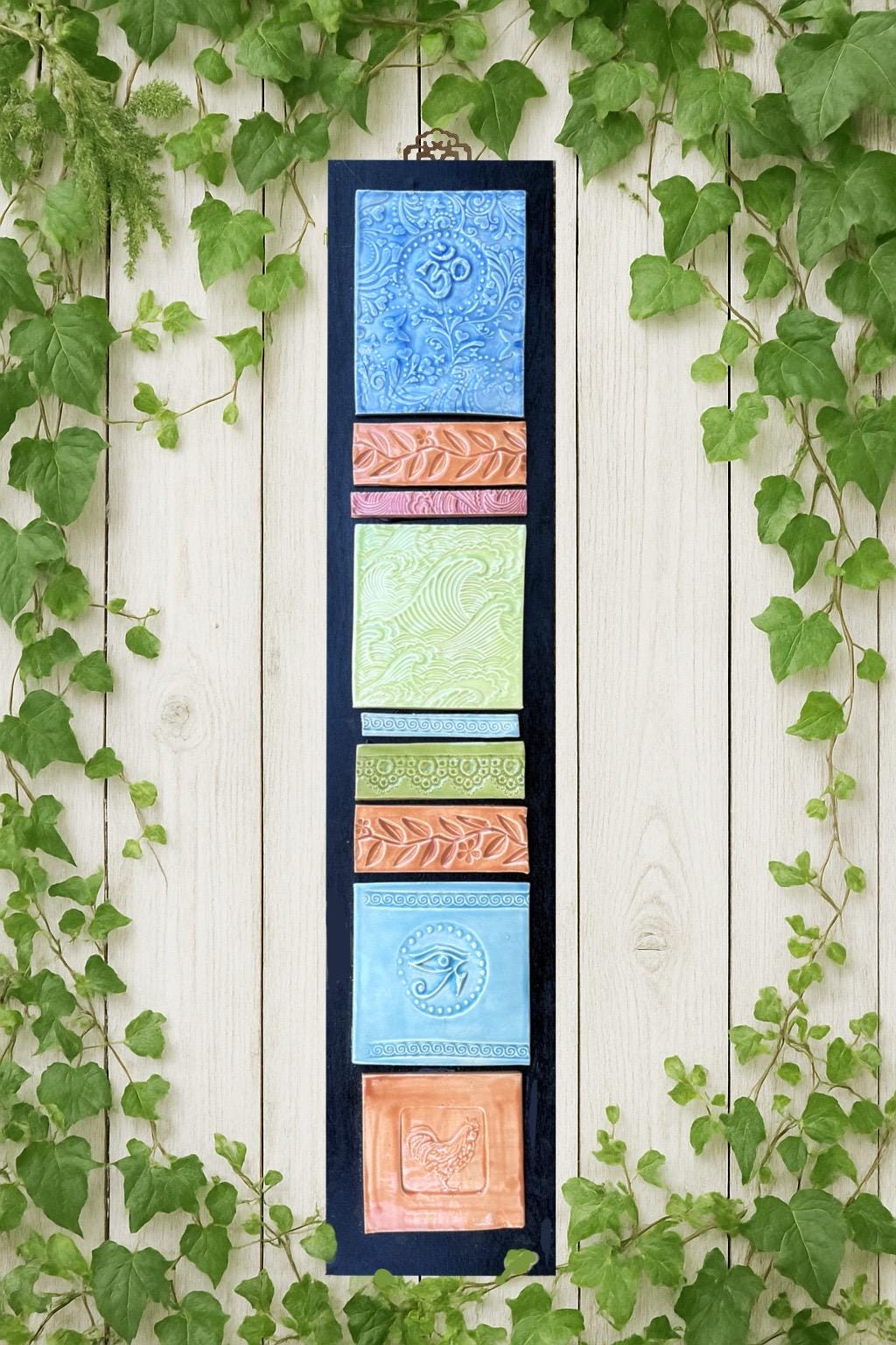 This handmade ceramic wall hanging features a beautiful vertical arrangement of six textured tiles measuring 5" wide x 25" long, each uniquely glazed in soft, earthy hues of blue, green, and terracotta. Every tile showcases an individual embossed design — including floral motifs, swirling patterns, and symbolic imagery such as the Om and Eye of Horus — creating a harmonious blend of spiritual and natural themes.