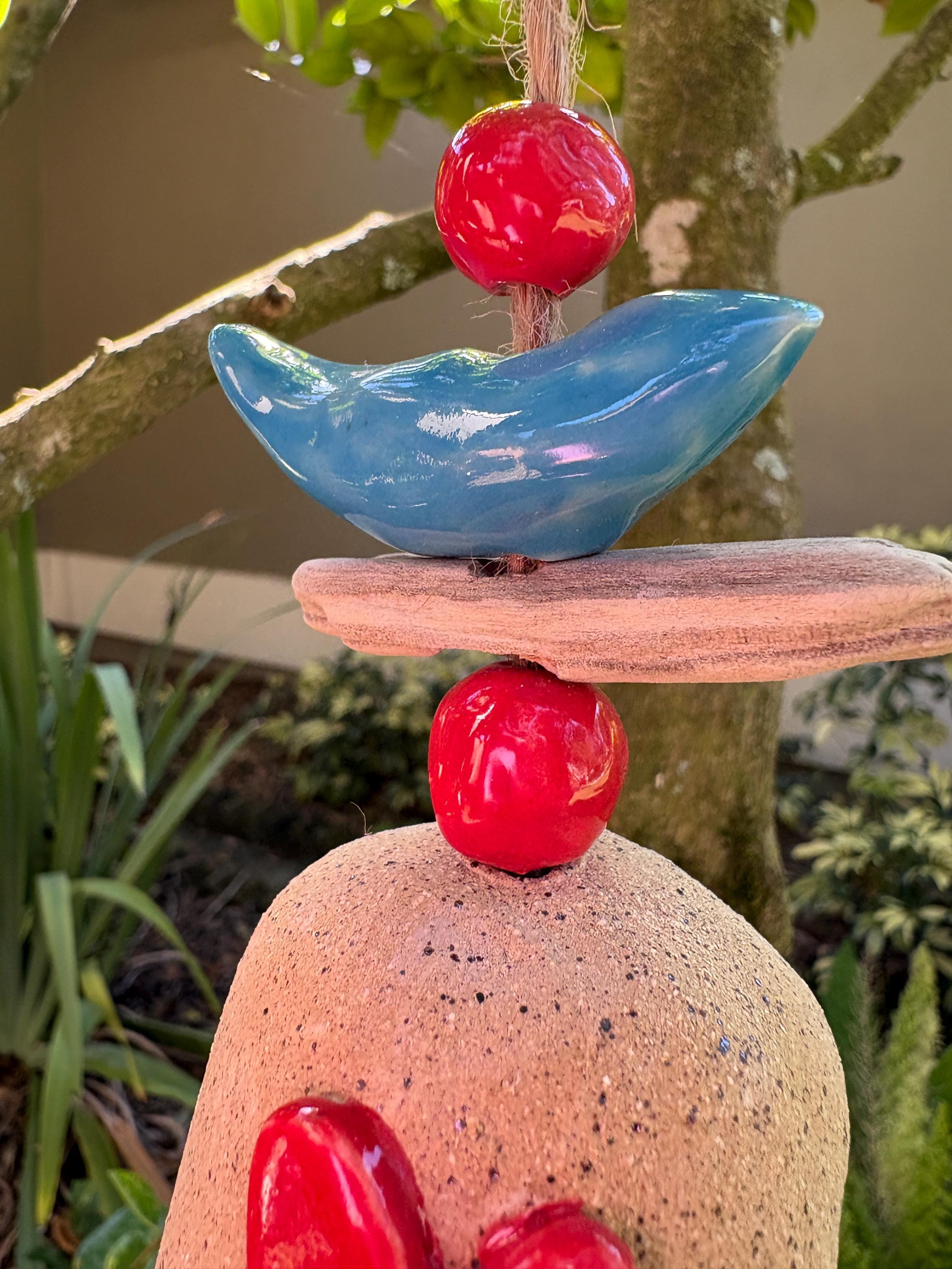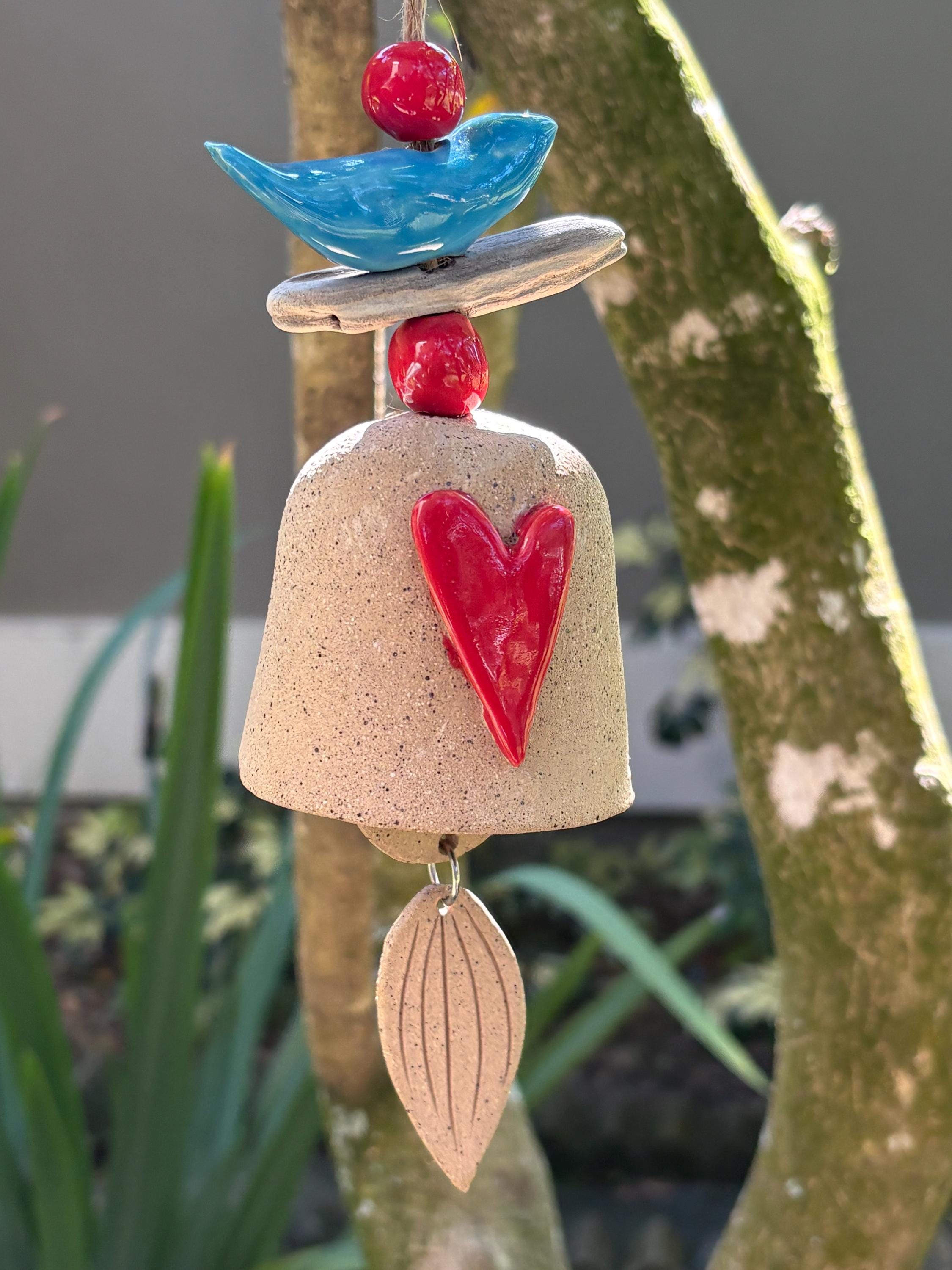 This charming handmade ceramic wind bell brings a touch of love and whimsy to your outdoor space. The natural stone-textured bell is adorned with a bold red heart, symbolizing warmth and joy. Above, a bright turquoise blue ceramic bird rests on a piece of driftwood, accented by glossy red beads for a cheerful pop of color. A leaf-shaped ceramic windcatcher sways below, catching the breeze and creating gentle, soothing tones.