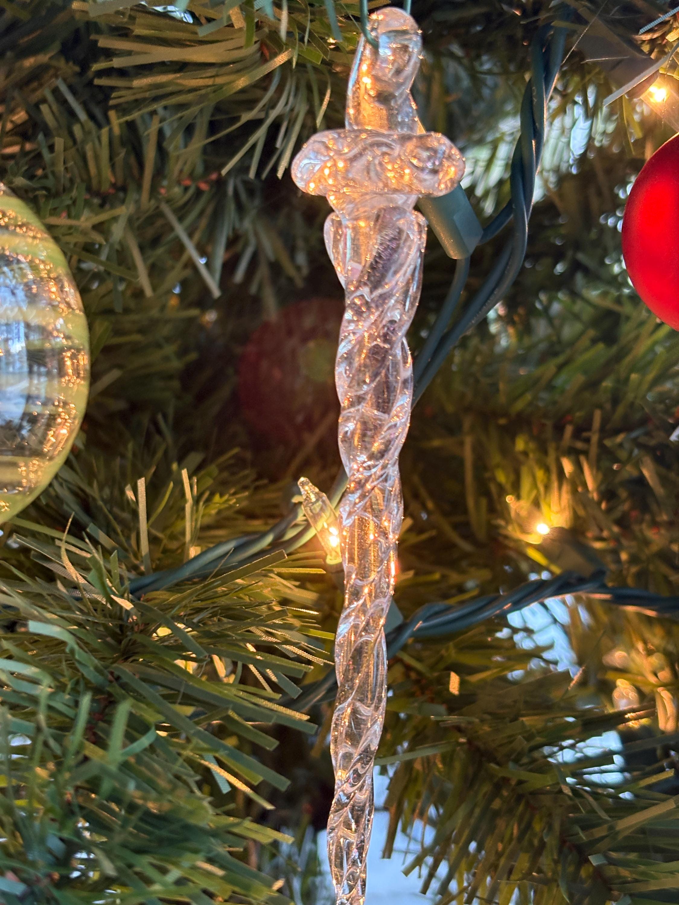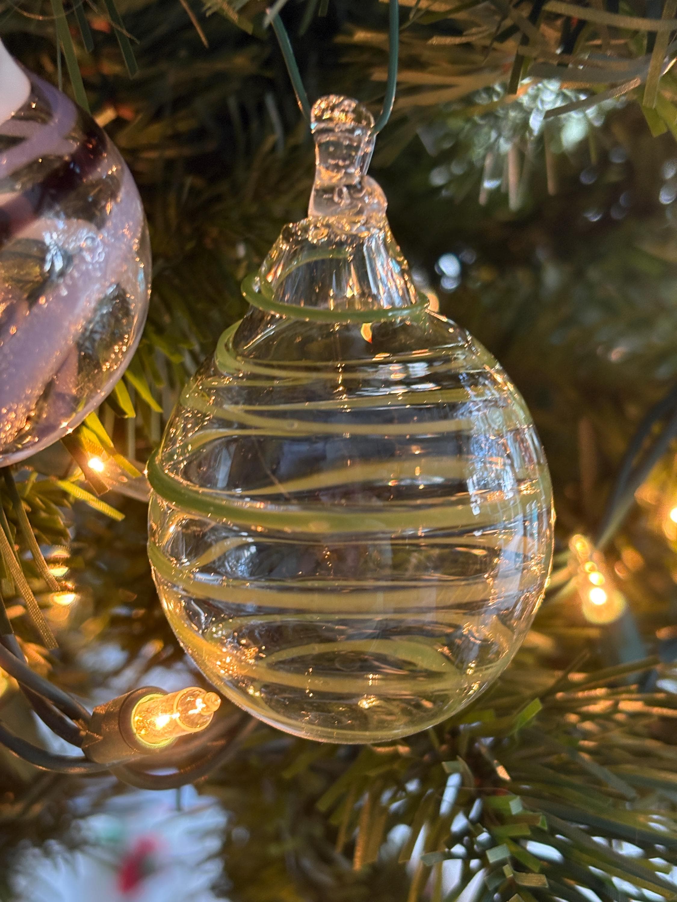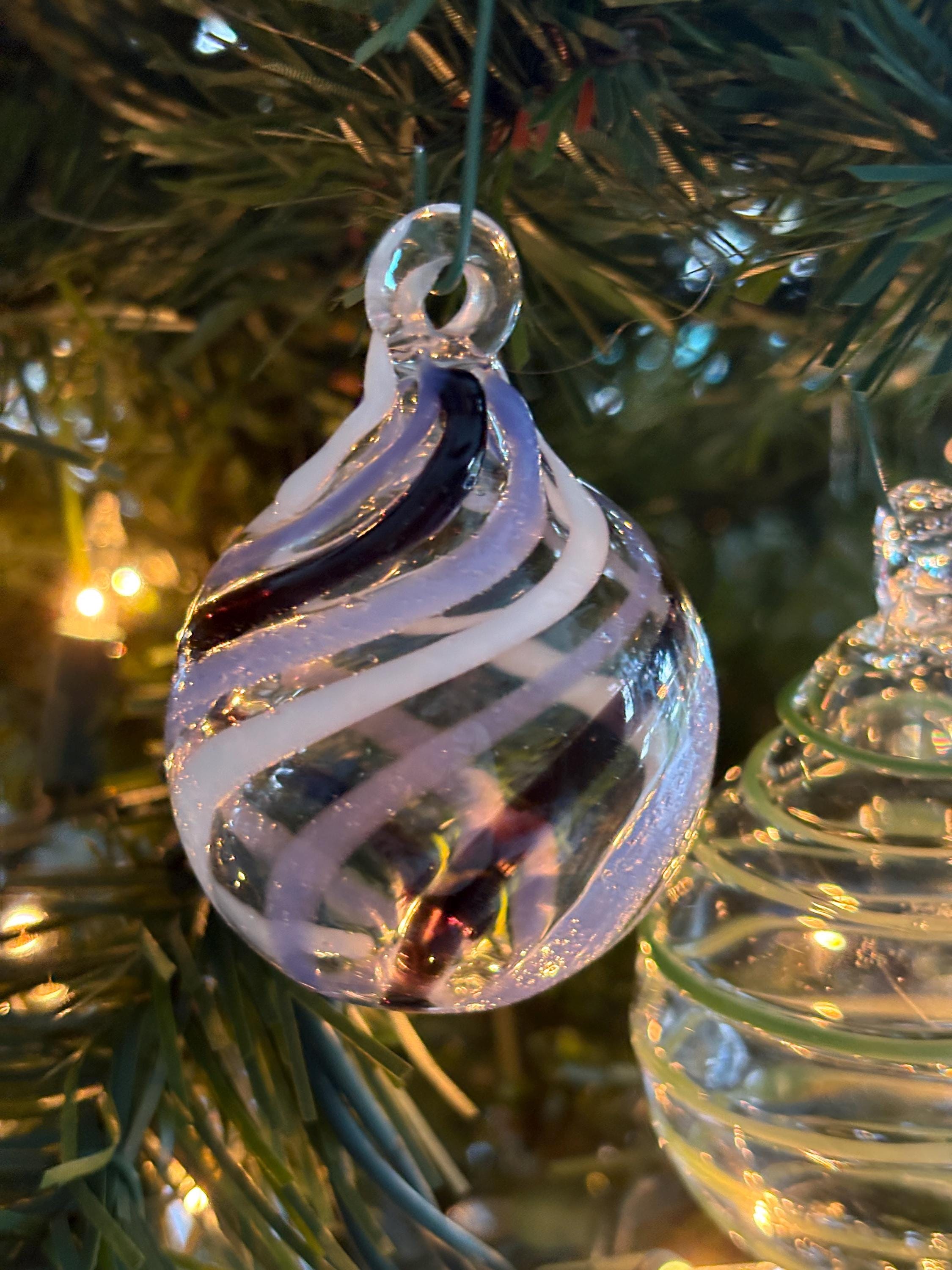 This beautiful trio of handblown glass ornaments adds a touch of sparkle and artisan charm to any Christmas tree. Each piece is crafted with care, capturing the warm glow of holiday lights and adding a magical shimmer to your décor. Baubles are (2) 2" diameter.and (1) 1.5" dia.and the icicle is 5.5" long.