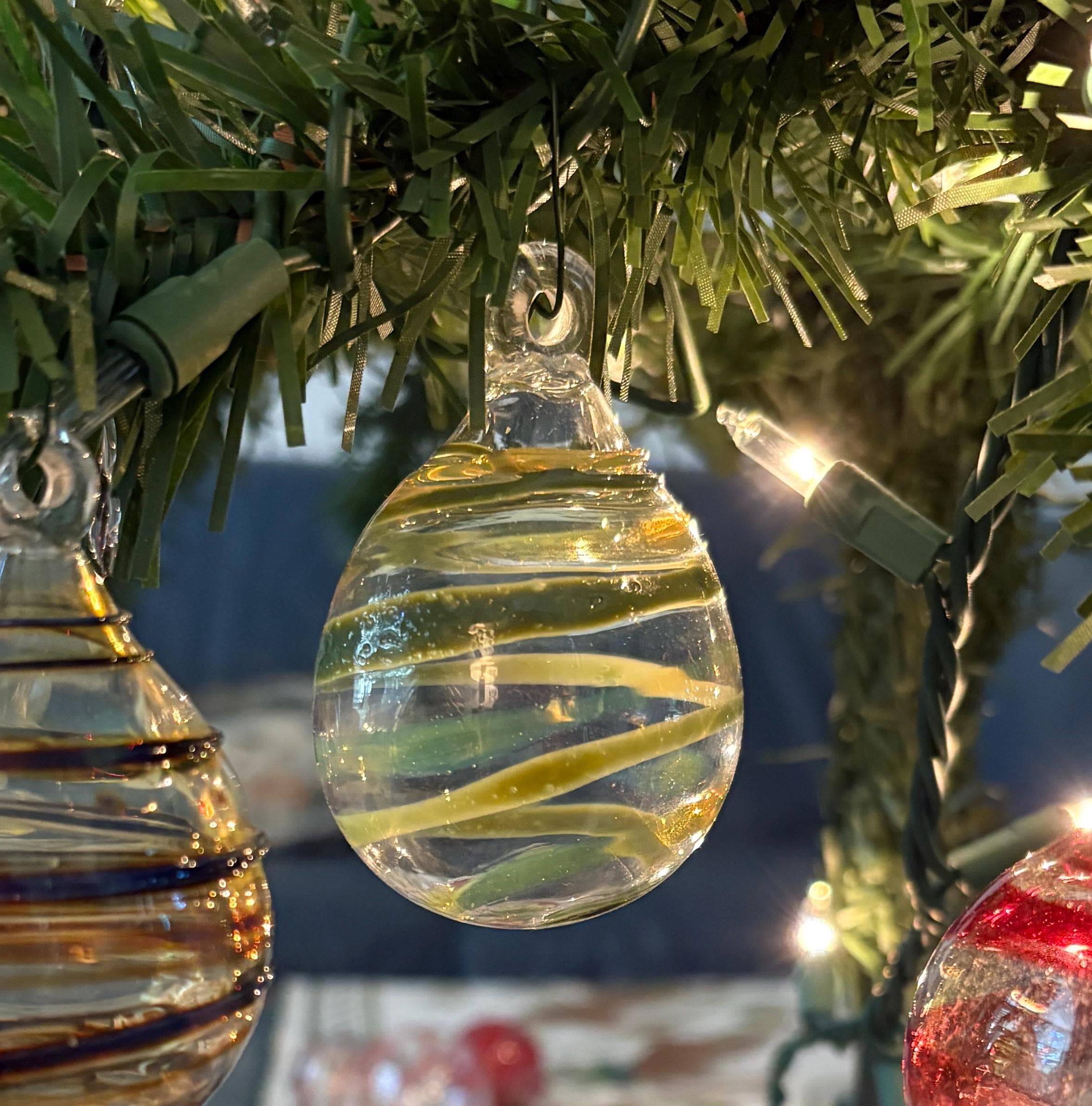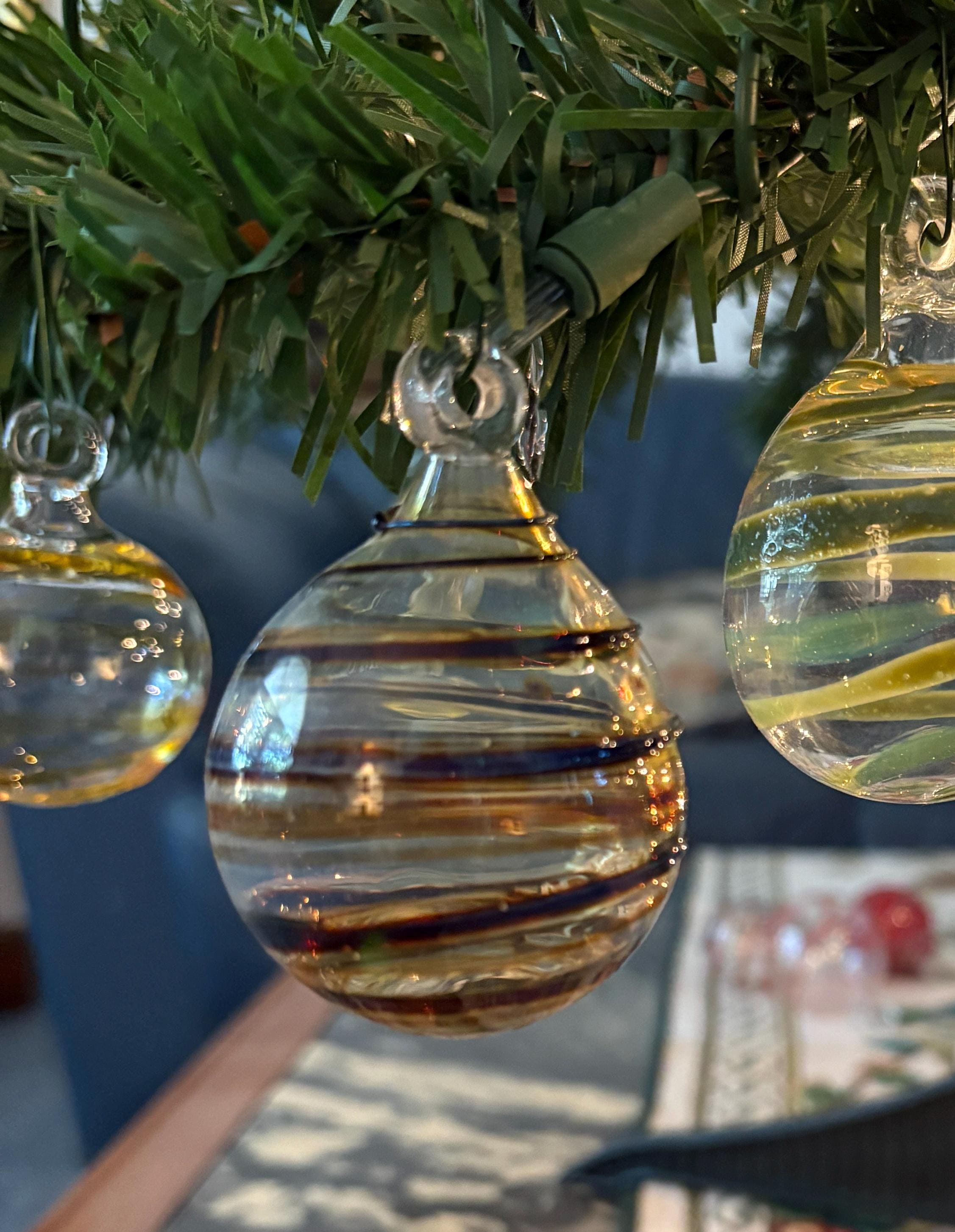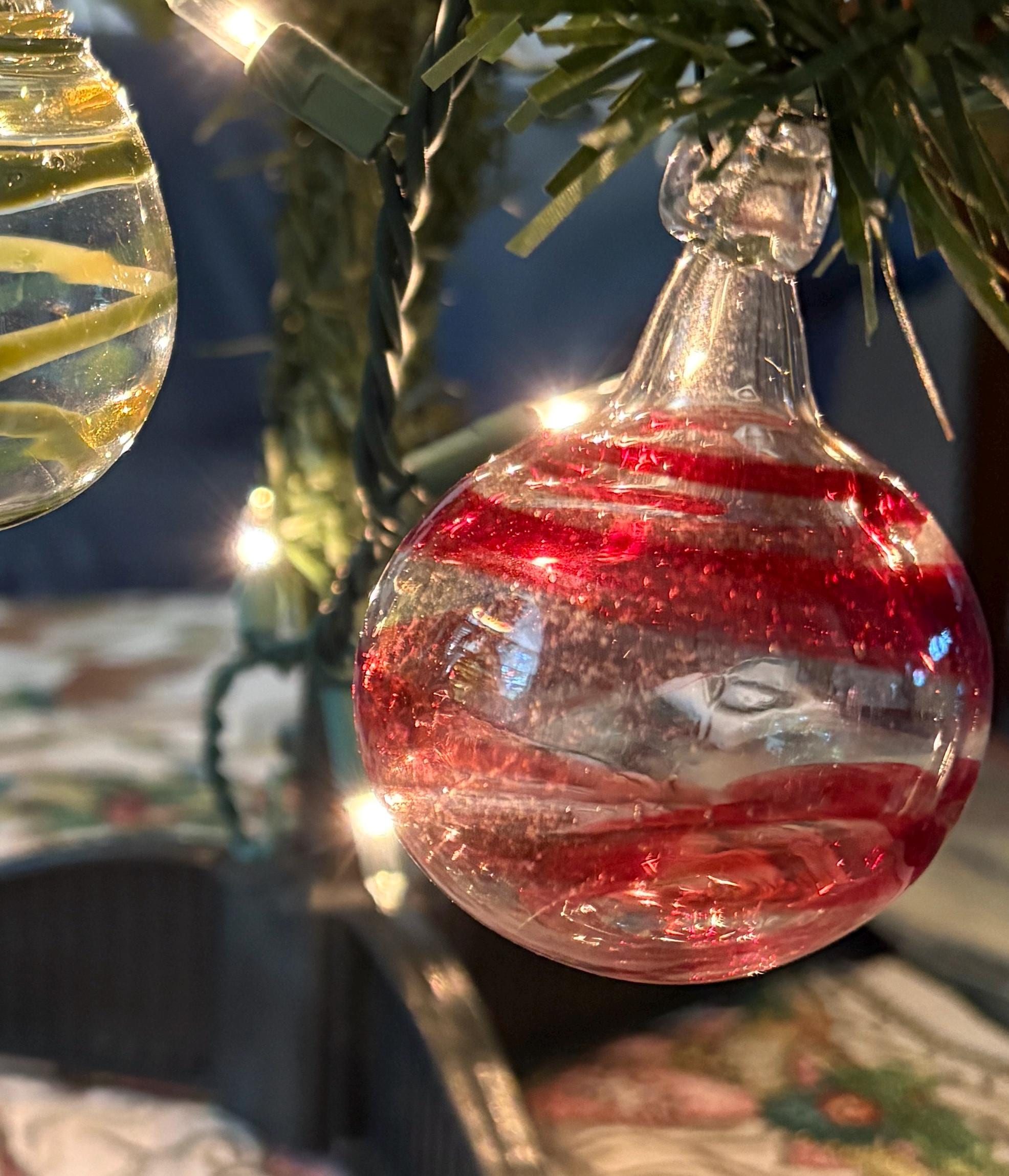 These handcrafted blown glass ornaments bring a warm, artisan touch to your holiday décor. They measure 1.75", 1.5" and 1.5". Each ornament features a unique swirl pattern—one with rich amber and deep brown ribbons, one with soft gold and white spirals, and one with festive red and white shimmer. The clear glass catches the lights beautifully, creating a sparkling, elegant glow on your tree.