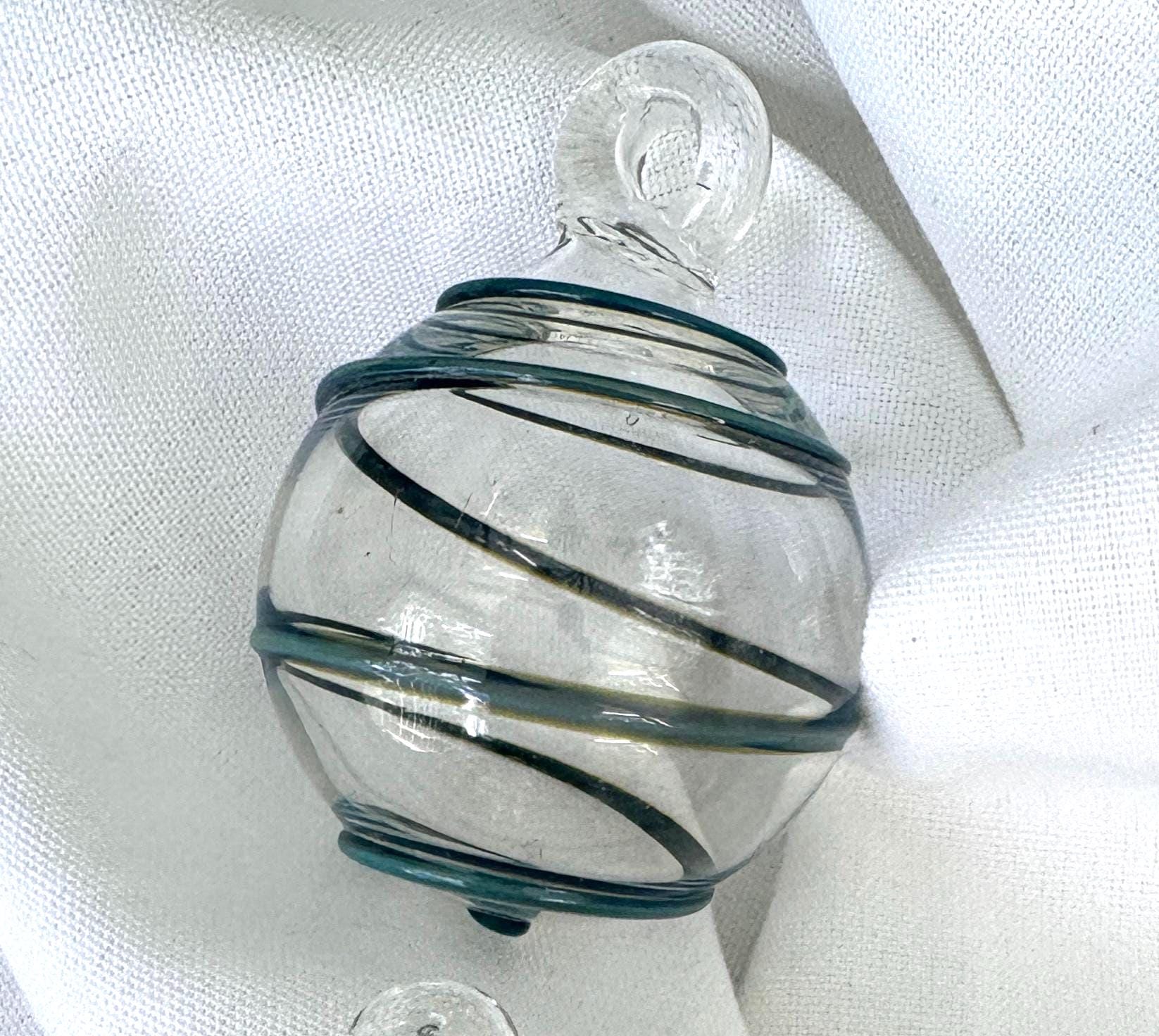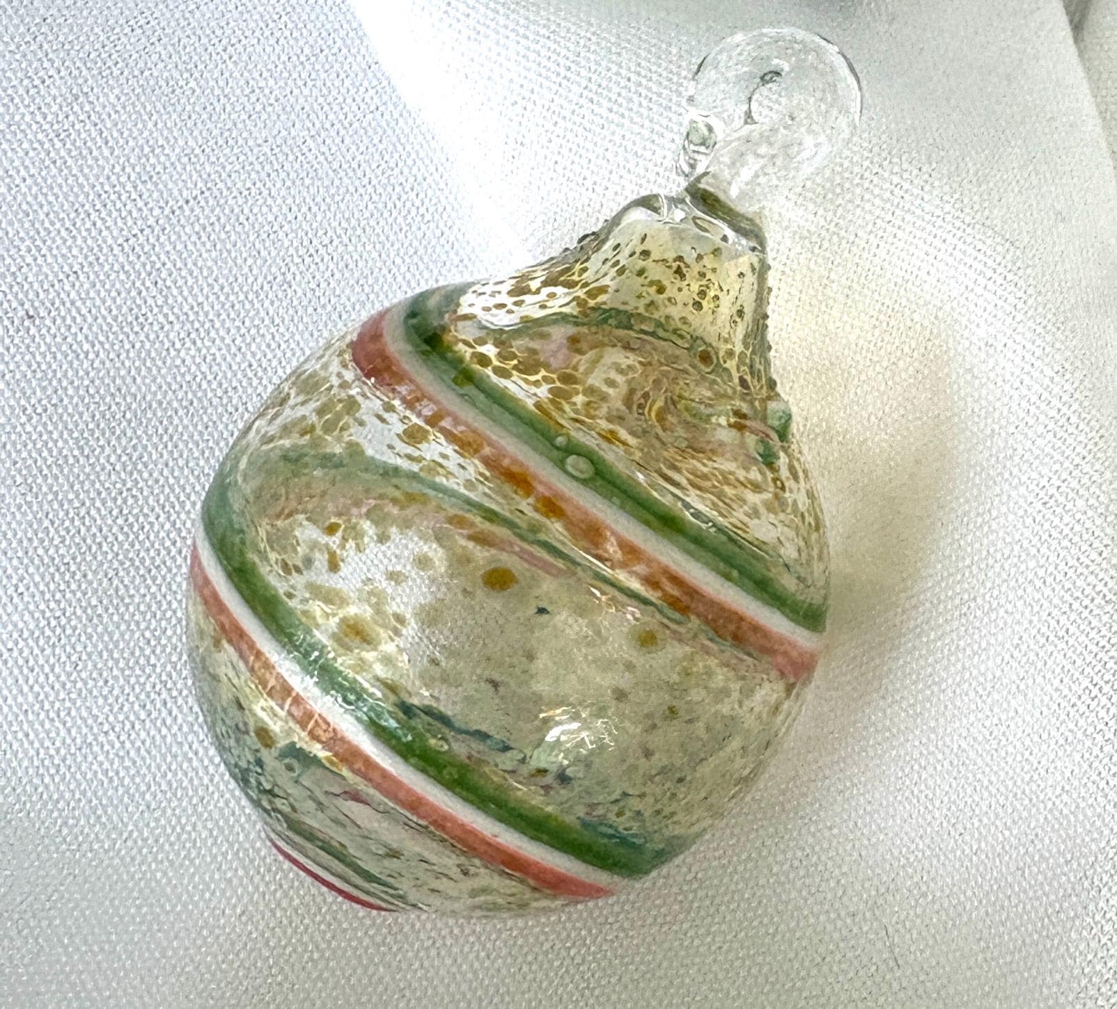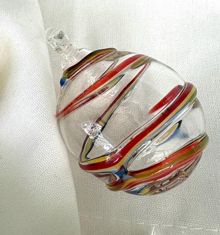 These handcrafted blown glass ornaments bring a warm, artisan touch to your holiday décor. Each ornament features a unique swirl pattern—one with rich amber and deep brown ribbons, one with soft gold and white spirals, and one with festive red and white shimmer. The clear glass catches the lights beautifully, creating a sparkling, elegant glow on your tree.