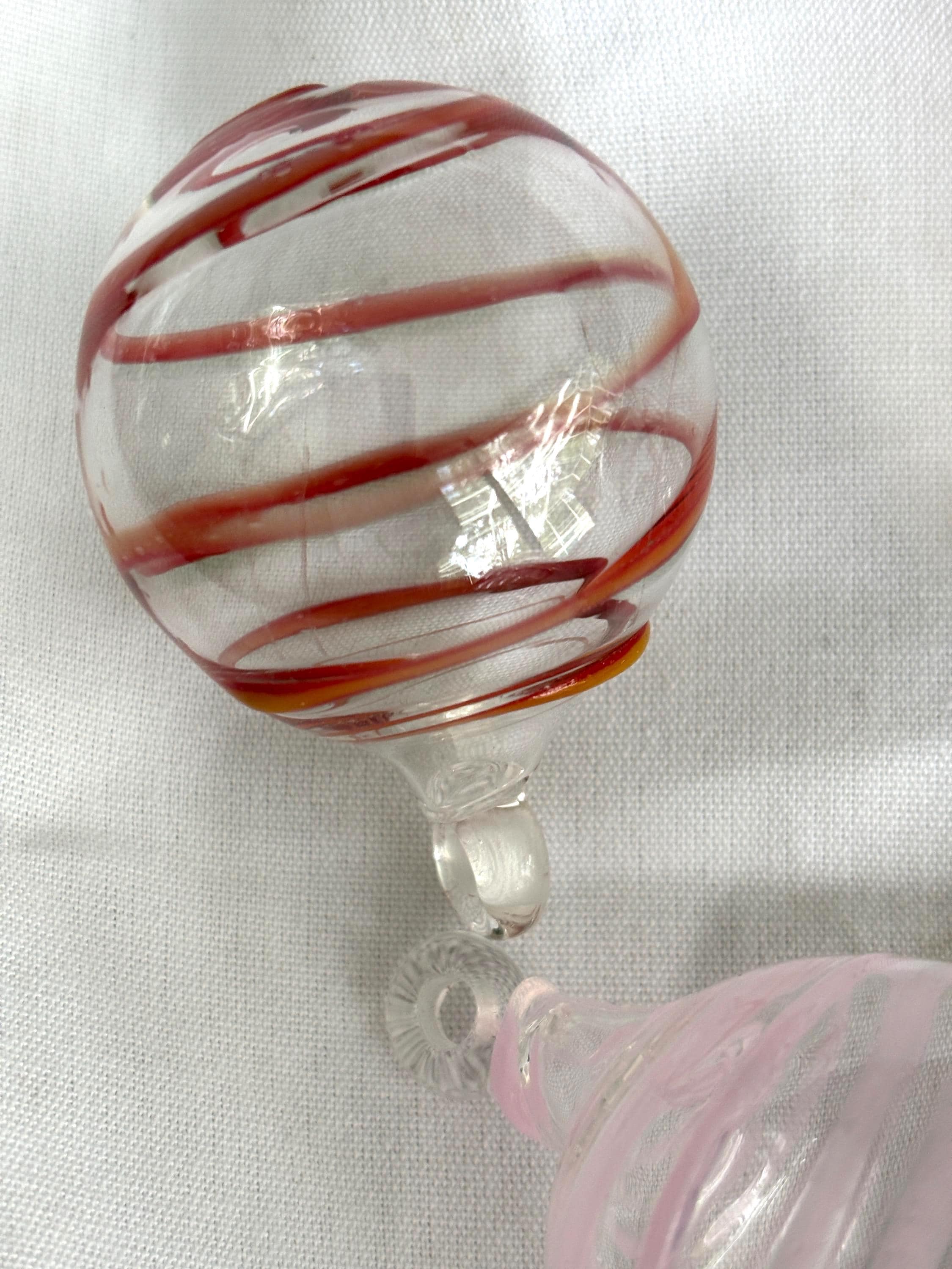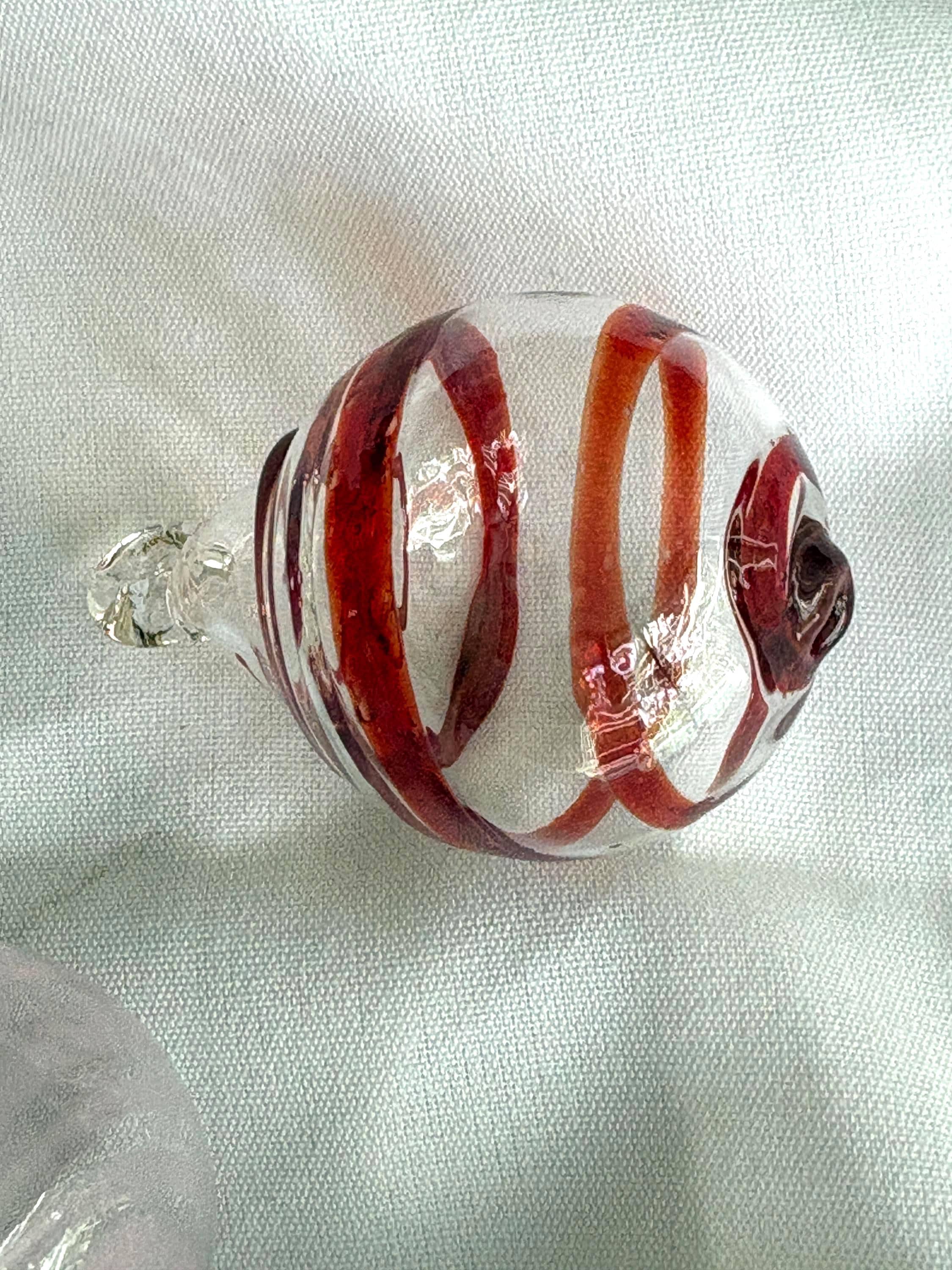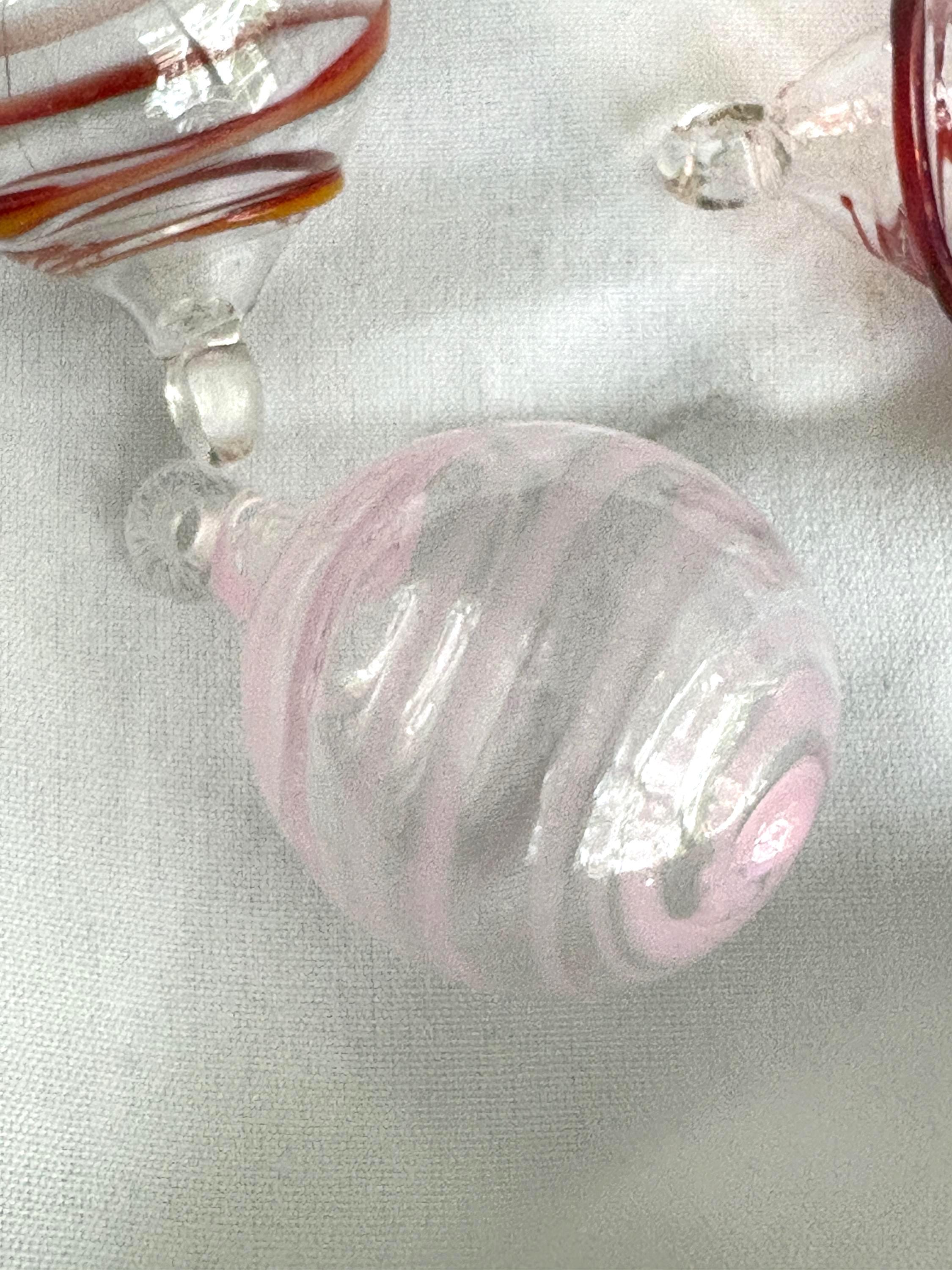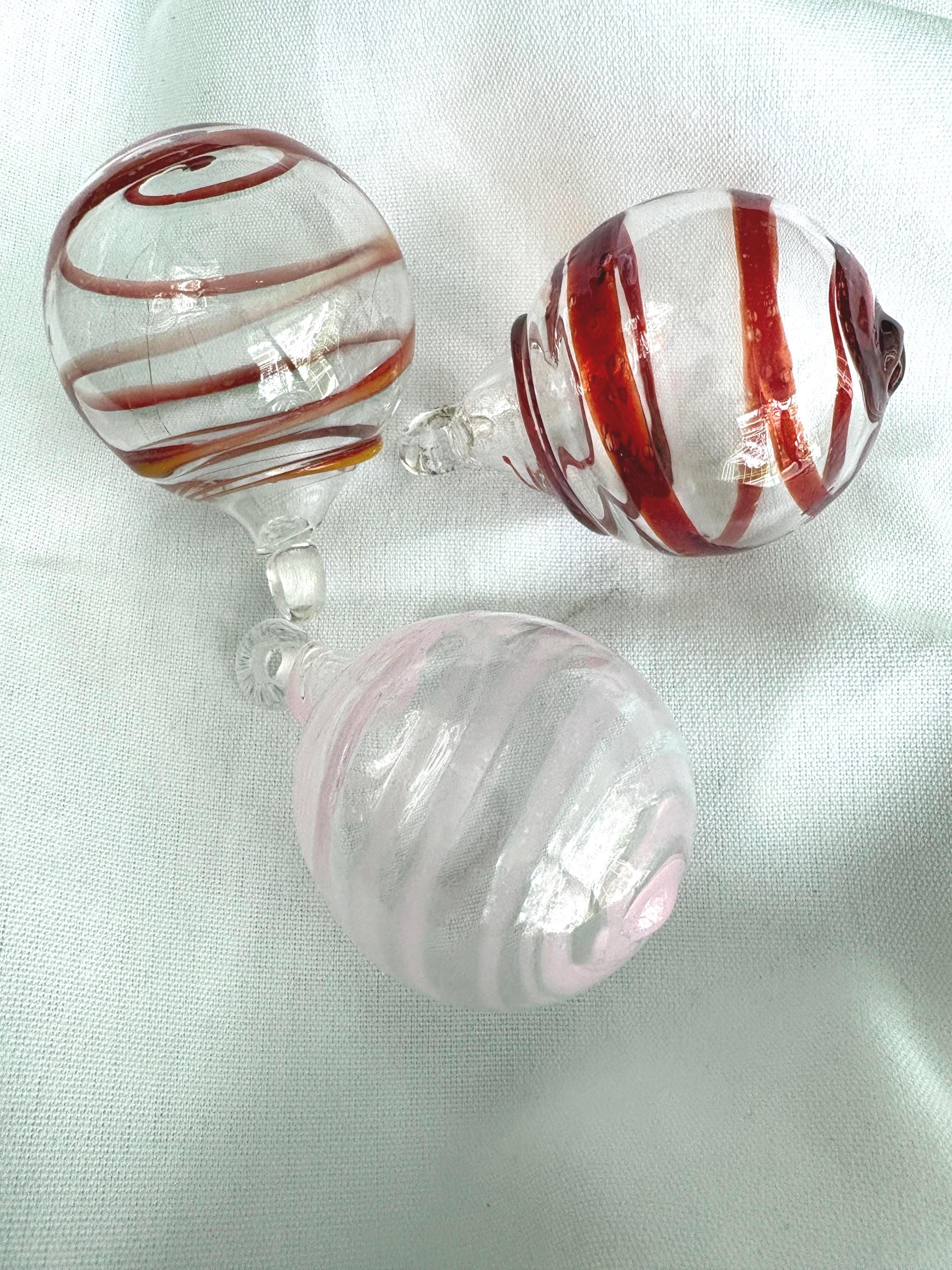 This set of handblown glass Christmas ornaments features elegant swirling ribbons of color suspended in clear glass. Each ornament is individually crafted, giving it its own unique pattern and gentle variations that highlight true artisan workmanship. Rich red swirls add a classic holiday warmth, while the soft blush pink ornament brings a subtle, romantic contrast.