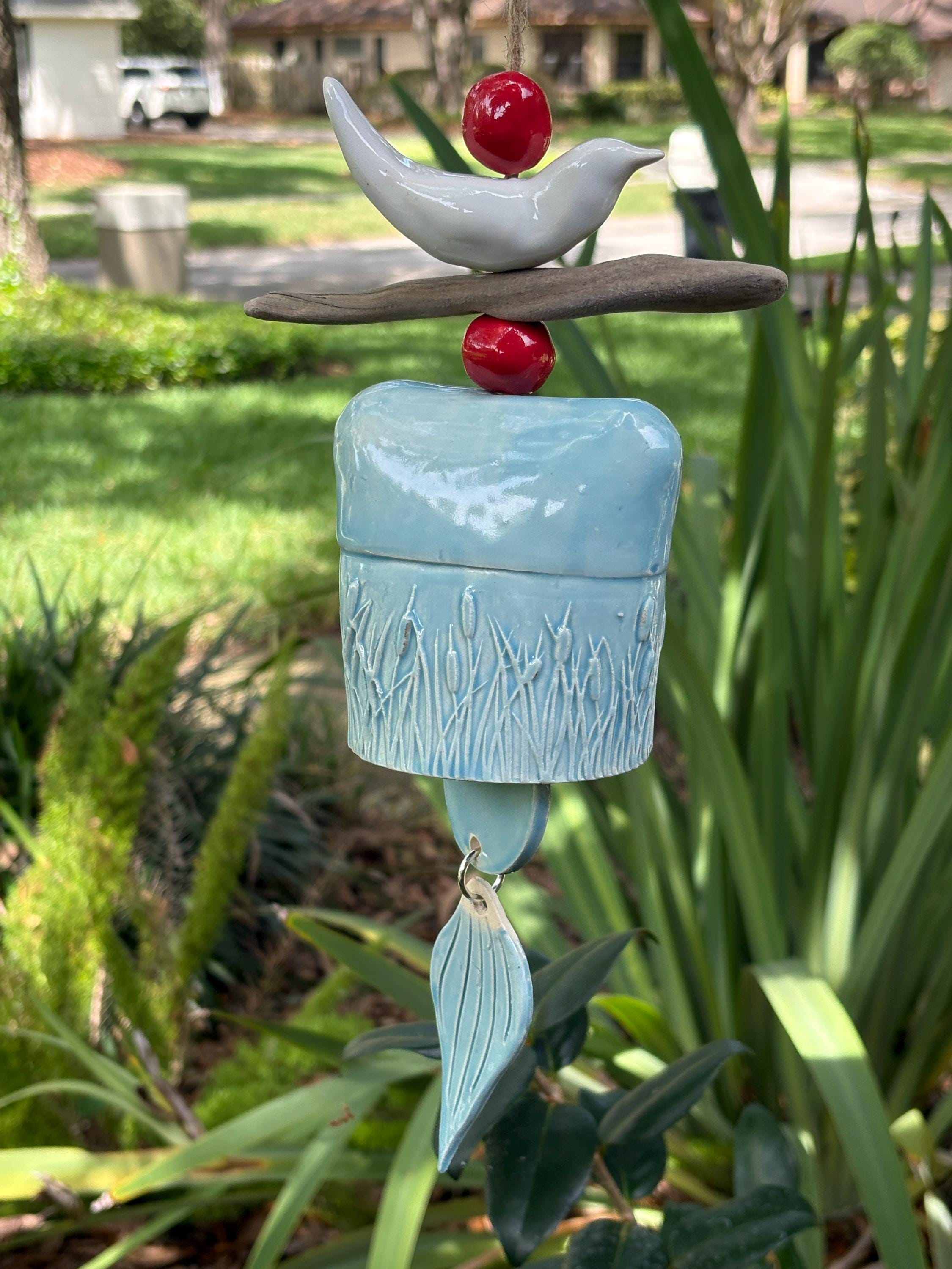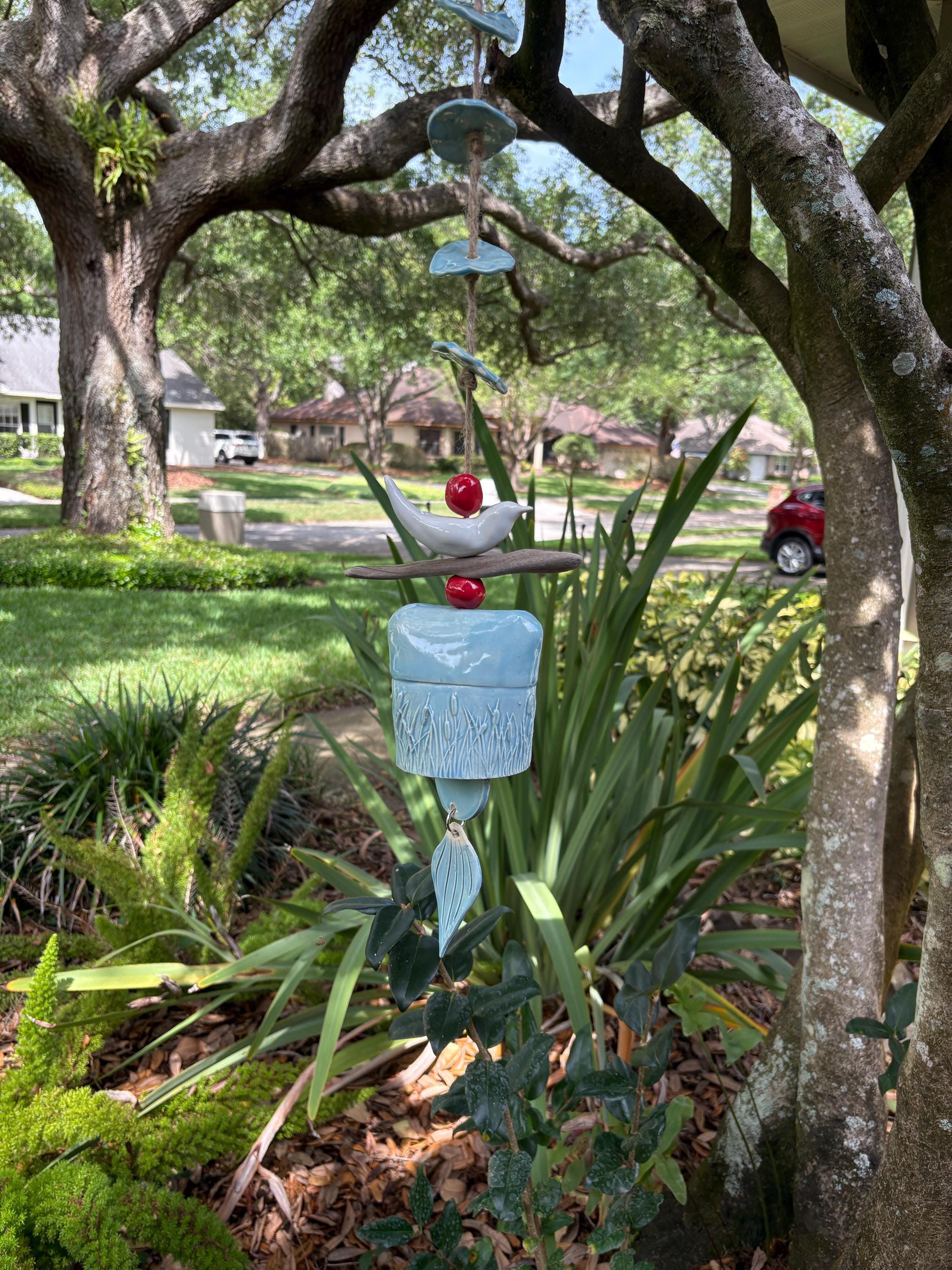 This wind bell is a handcrafted ceramic garden ornament with a soft, coastal aesthetic. The main body is a glazed, seafoam-blue The glaze has a subtle sheen that catches the sunlight beautifully.