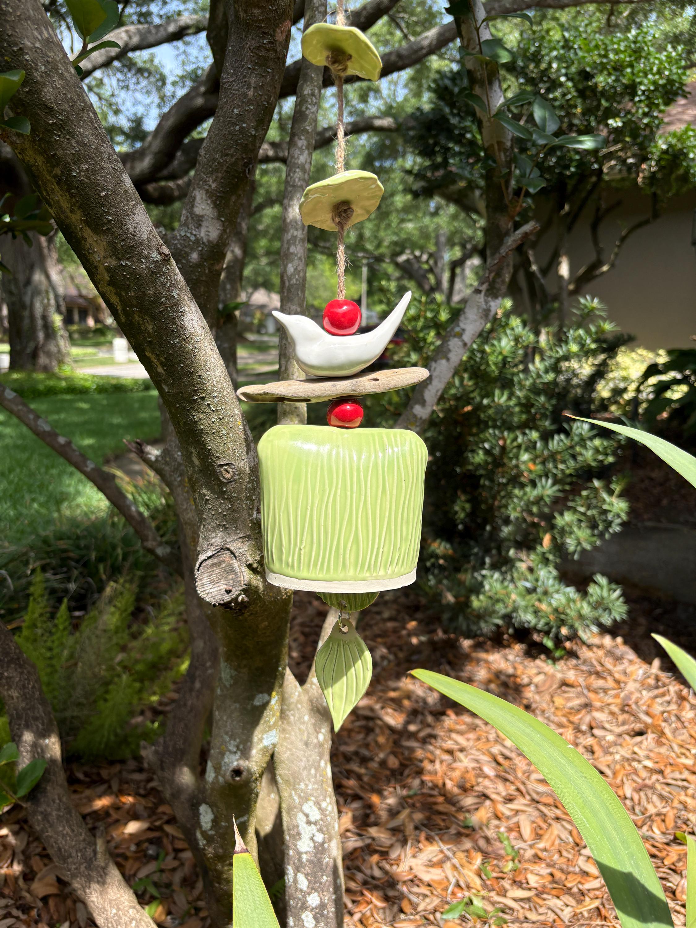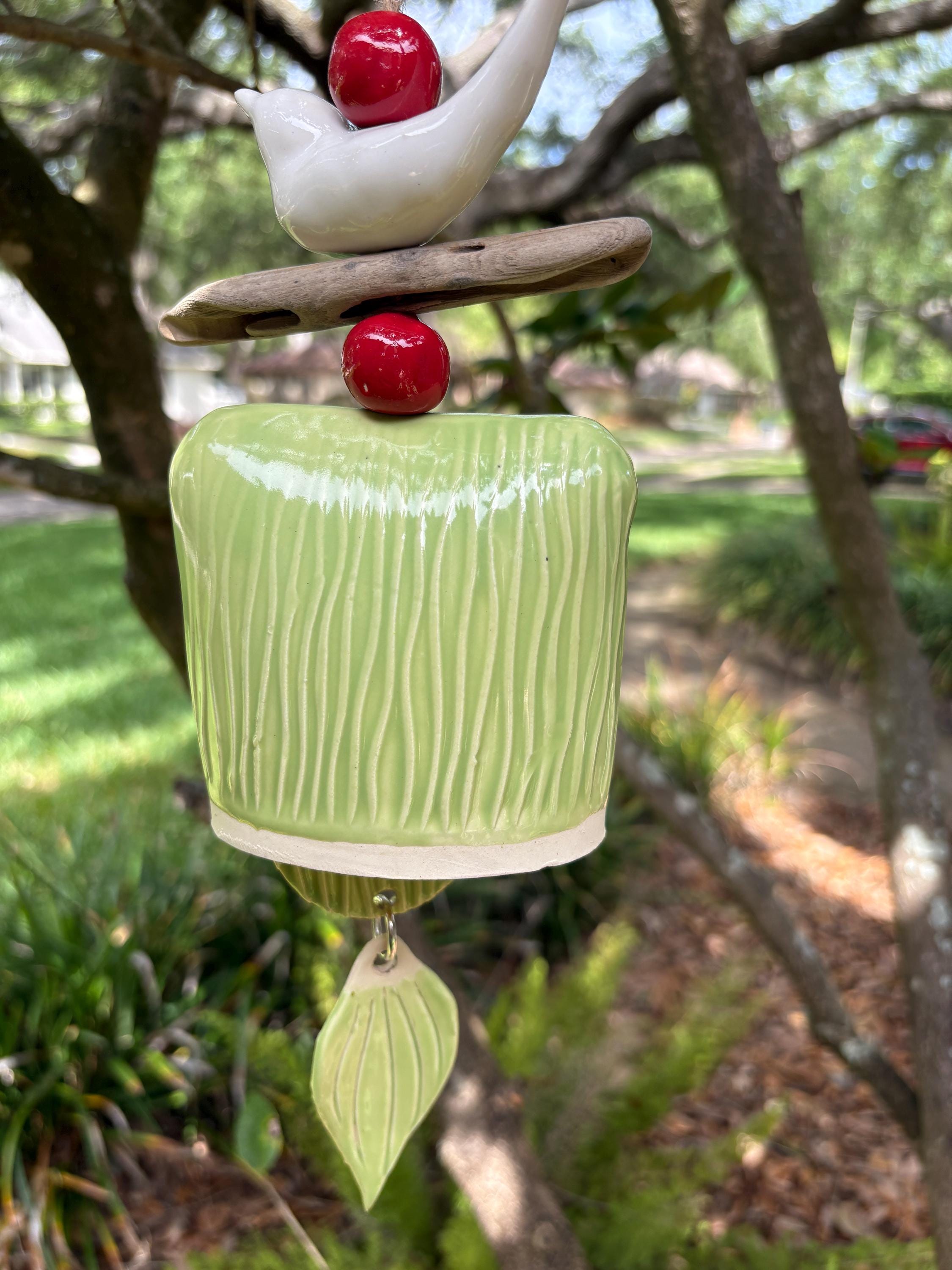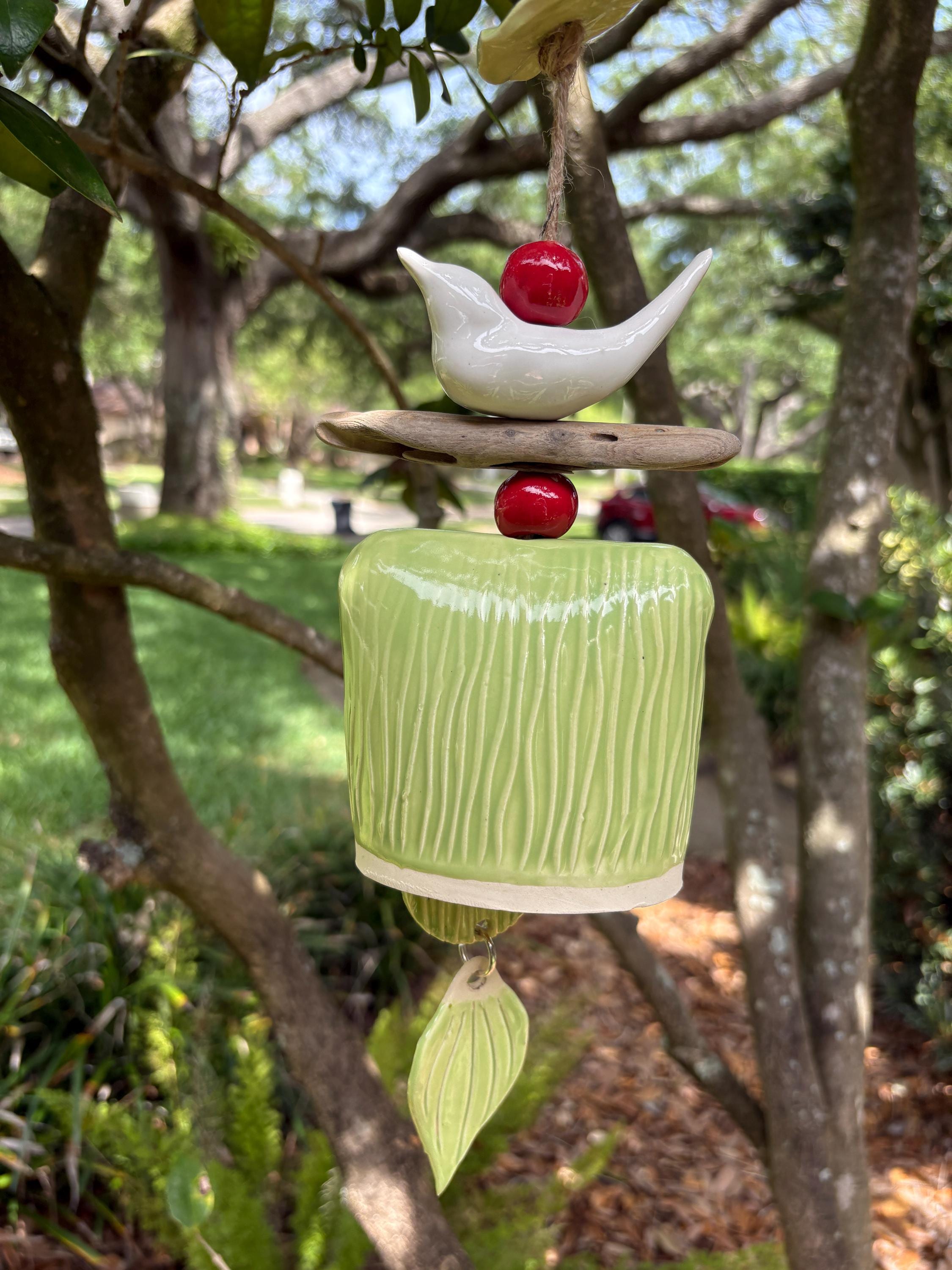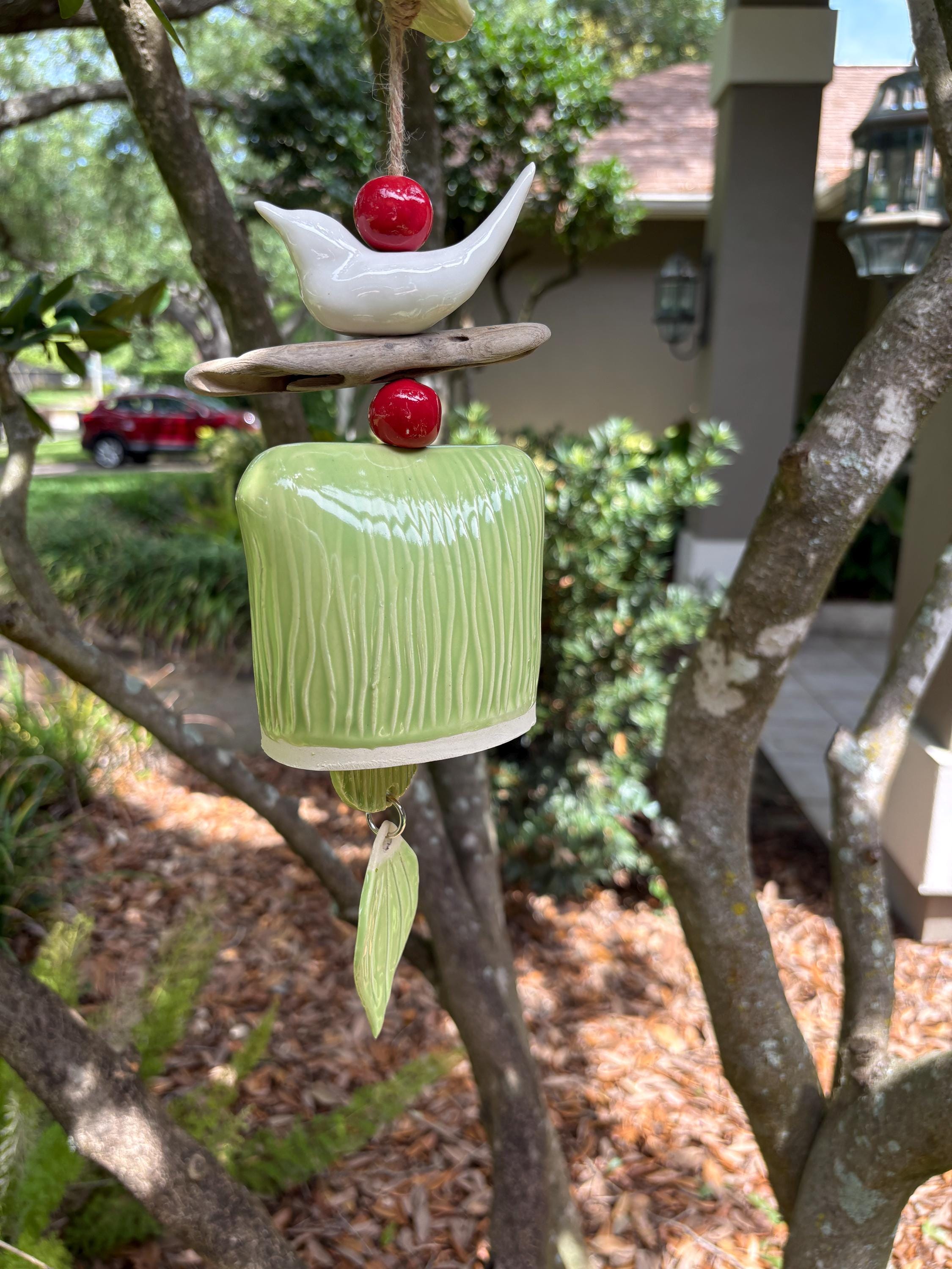 Bring a touch of nature and serenity to your outdoor space with this handcrafted ceramic wind bell. Featuring a hand-sculpted blue bird perched atop natural driftwood, vibrant red ceramic beads, and a beautifully textured bell, this unique piece is both decorative and functional. The soft chime it produces is gentle and soothing, perfect for gardens, patios, or porches.